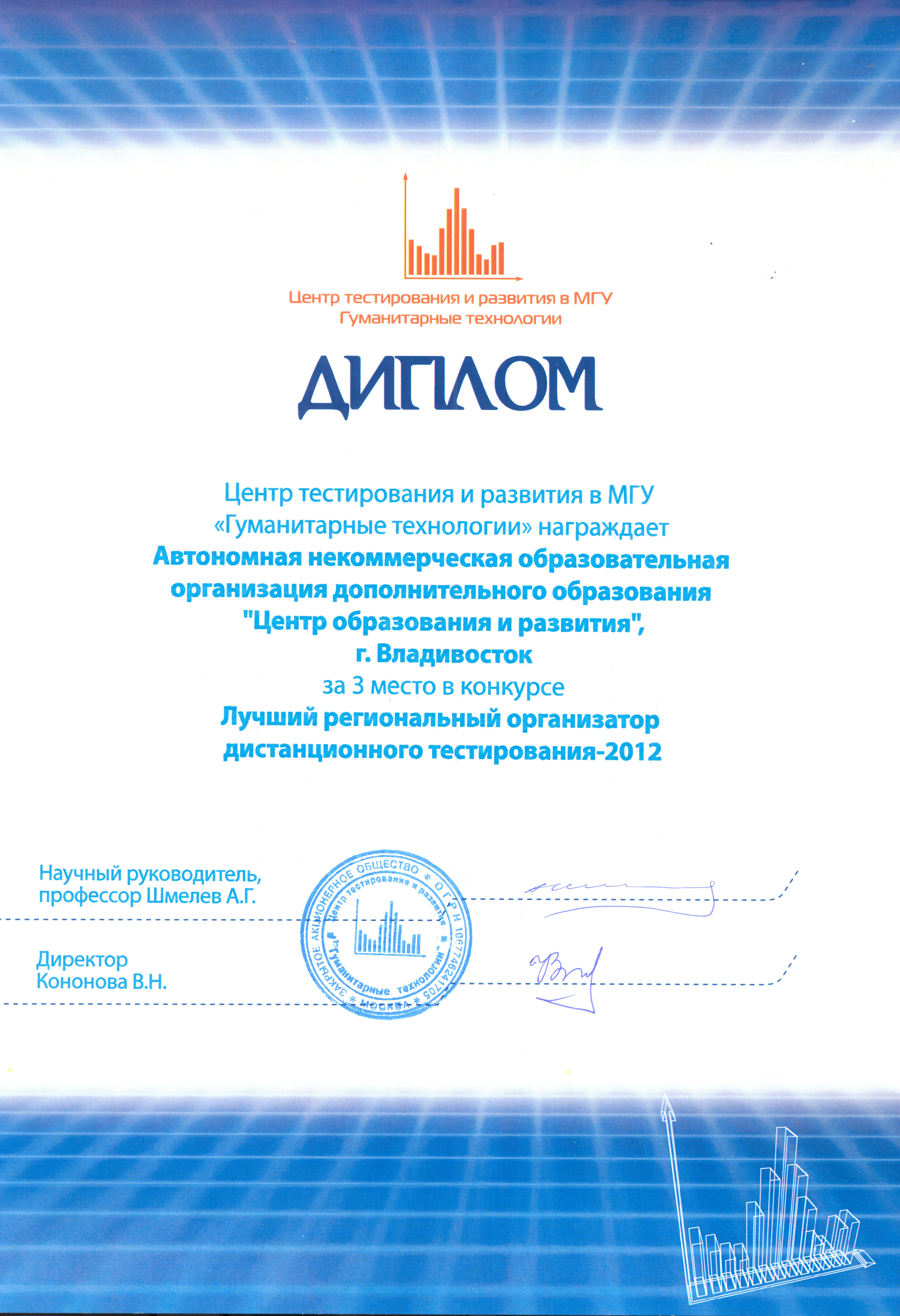 Центр "Абитуриент" - "Лучший региональный организатор дистанционного тестирования-2012"